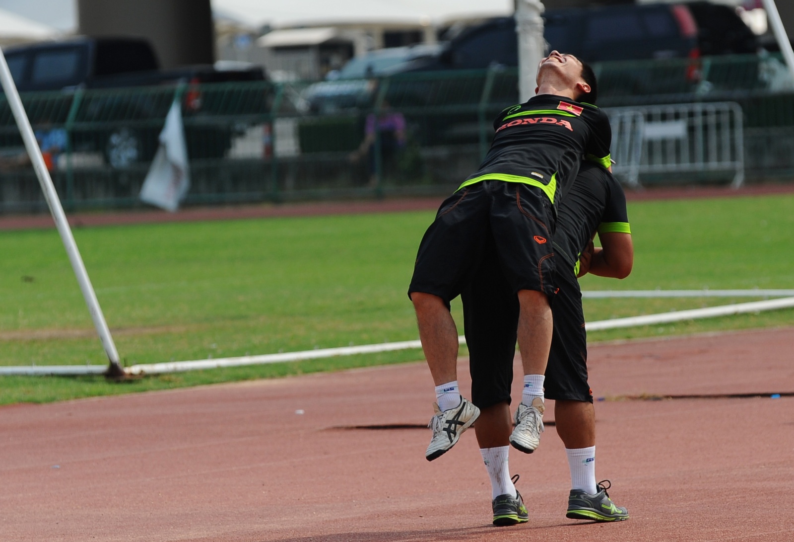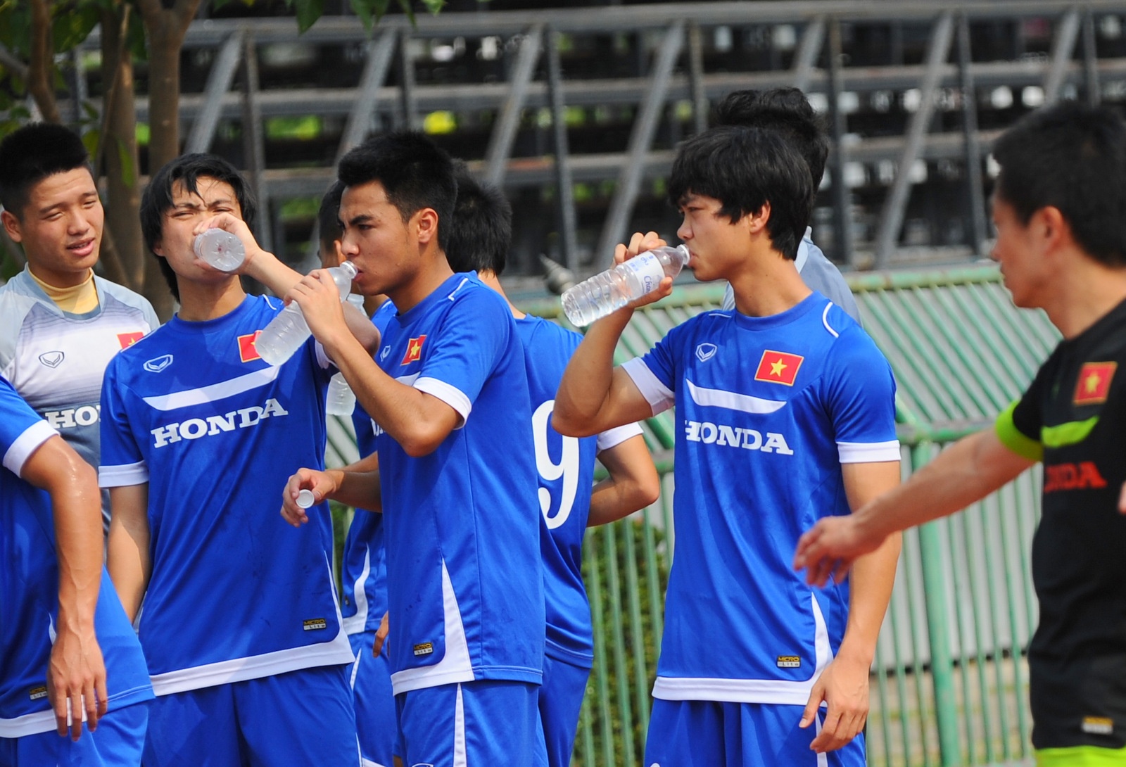 | Thời tiết ban ngày tại Bangkok khoảng 34 độ C, các cầu thủ chỉ tập nhẹ trong vòng 40 phút trước khi uống nước và lên xe trở về khách sạn. |