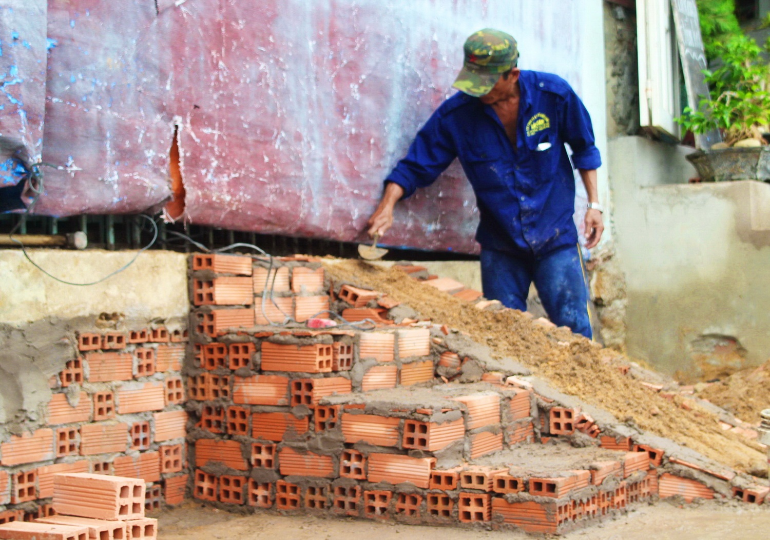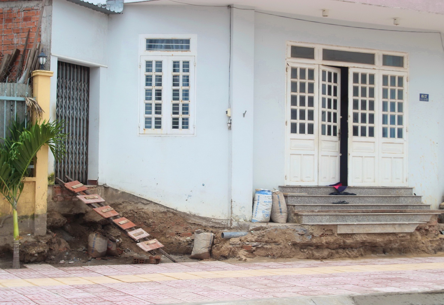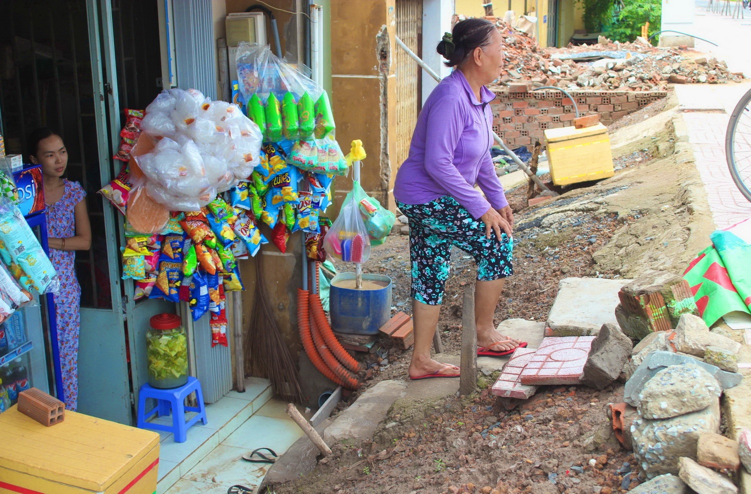 | Vợ chồng ông bà Phan Thị Phương xây thêm bậc tam cấp vào nhà. Nhà của ông bà thấp so với mặt đường cả mét. Bà Phương cho biết: "Nhà chúng tôi có giấy tờ đầy đủ nhưng không hiểu sao vẫn chưa được phép nâng nền. Việc sinh hoạt rất bất tiện, kinh doanh buôn bán cũng bị ảnh hưởng". |