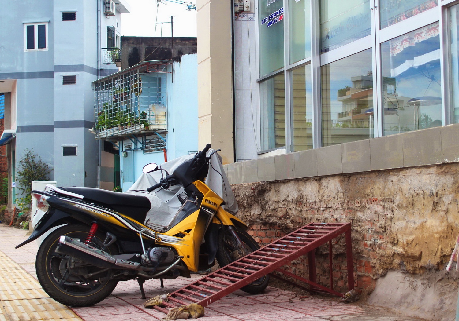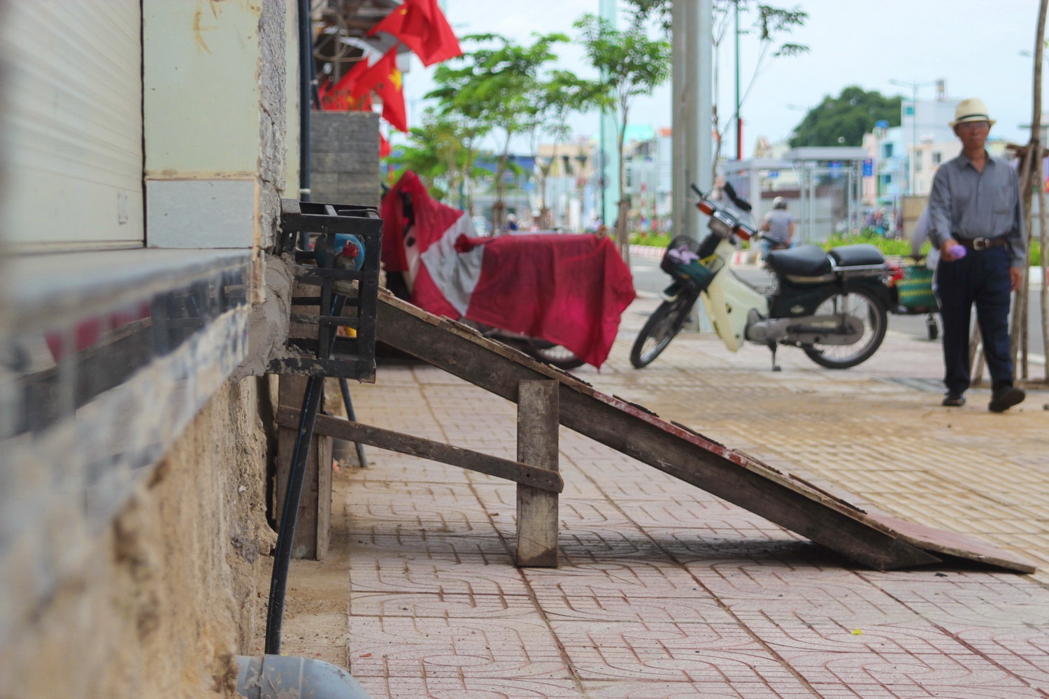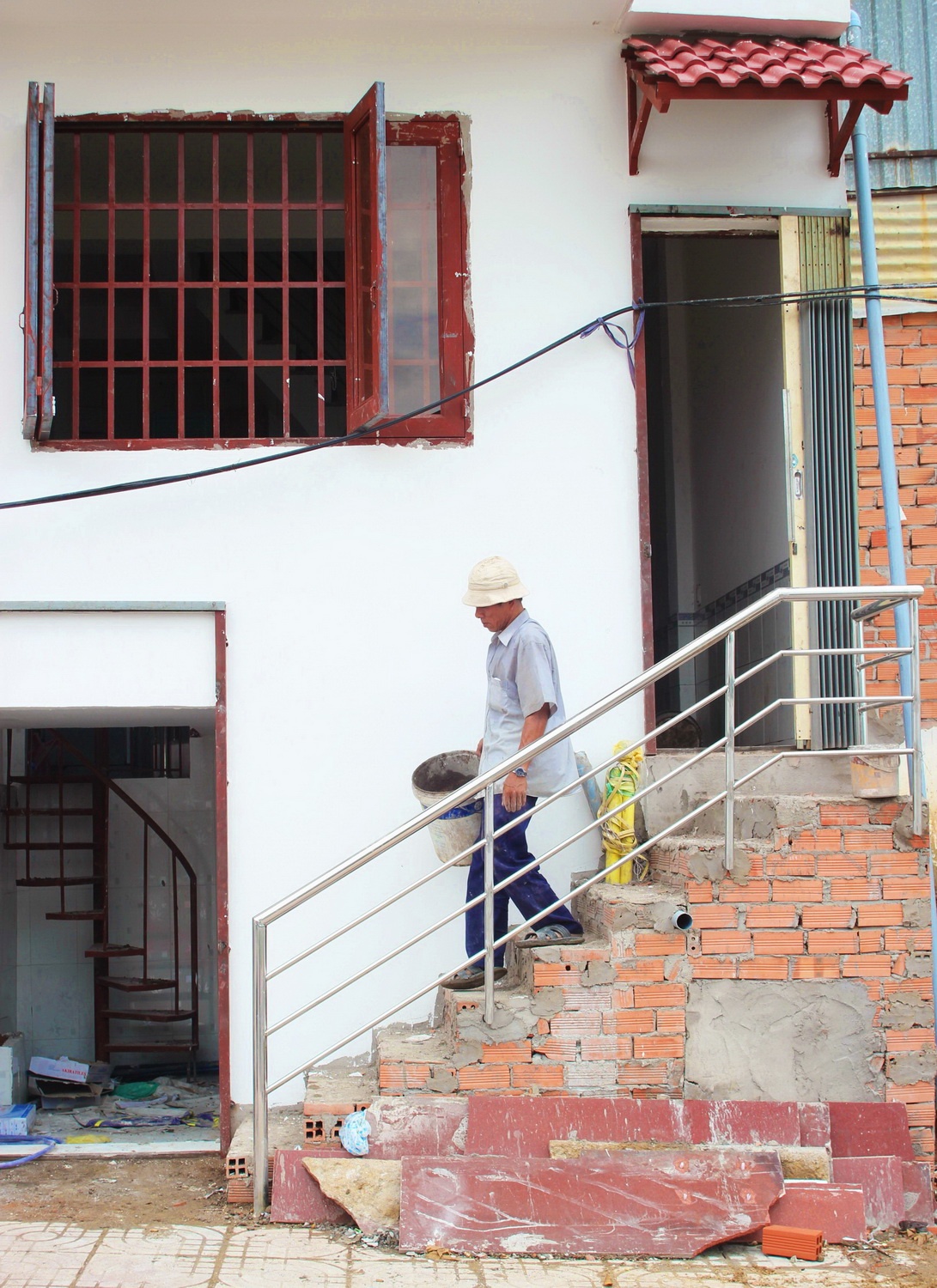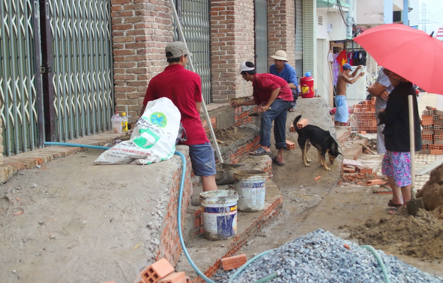 | Vợ chồng ông bà Phan Thị Phương xây thêm bậc tam cấp vào nhà. Nhà của ông bà thấp so với mặt đường cả mét. Bà Phương cho biết: "Nhà chúng tôi có giấy tờ đầy đủ nhưng không hiểu sao vẫn chưa được phép nâng nền. Việc sinh hoạt rất bất tiện, kinh doanh buôn bán cũng bị ảnh hưởng". |