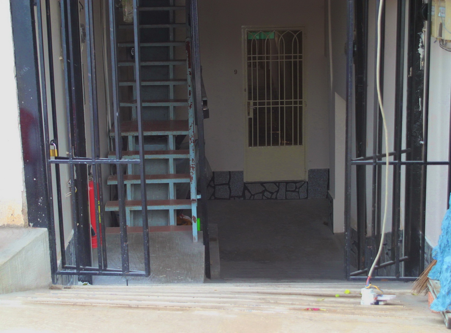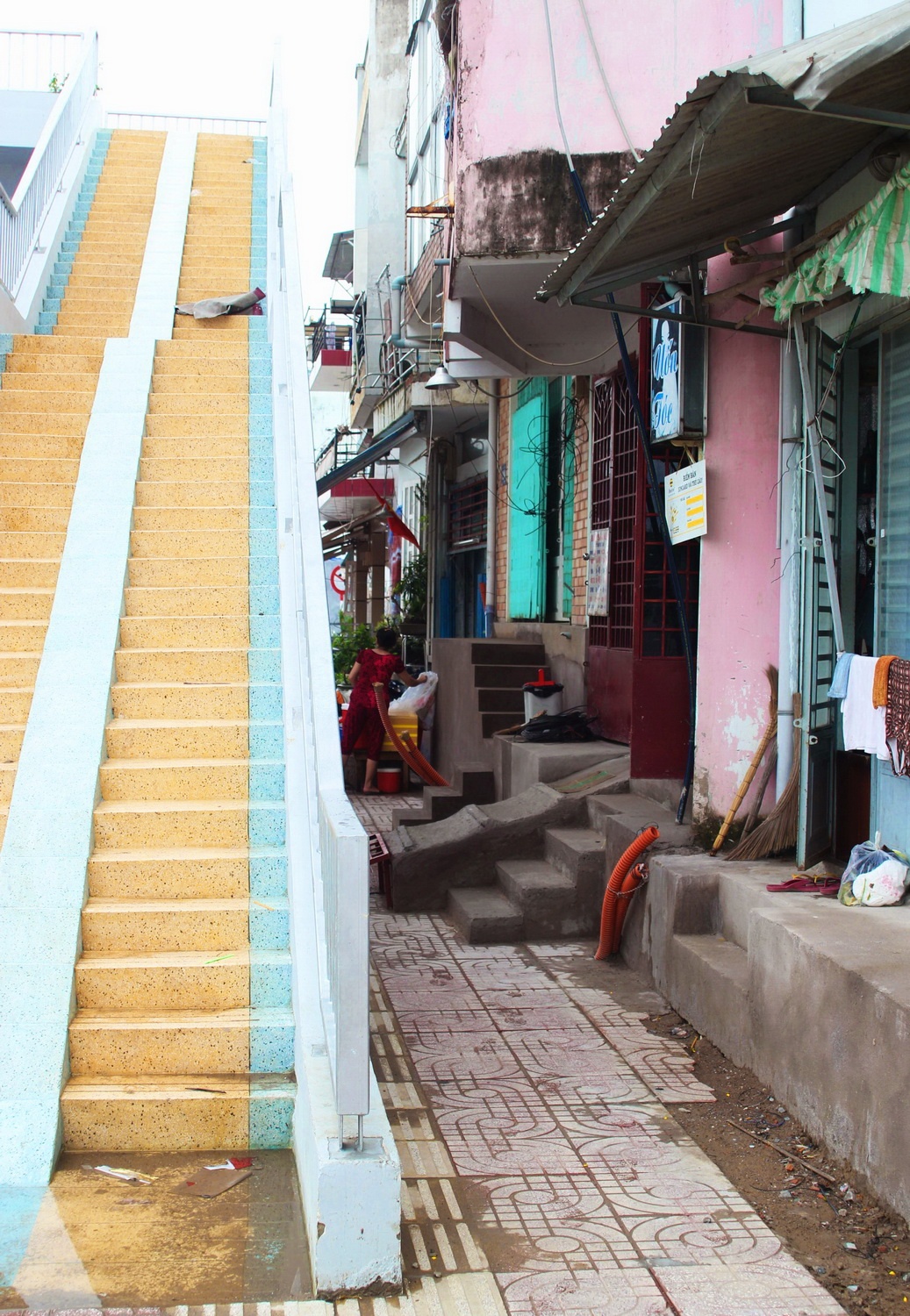 Một dãy các bậc tam cấp và chiếc "cầu thang" tạm bợ.