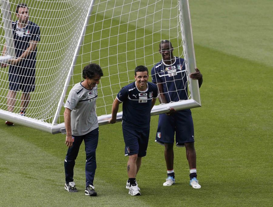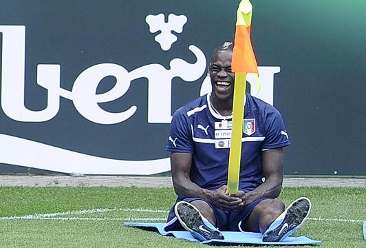 Cũng trong một buổi tập cùng Azzurri, Balotelli khiến đồng đội phải phì cười khi kẹp cột cờ góc vào háng rồi hẩy lên hẩy xuống.