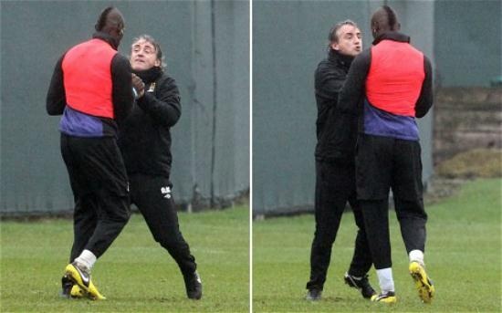 Bên cạnh khoảnh khắc chọc cười đồng đội, Balotelli còn có những hành động khiến HLV phải nổi điên. Anh từng khiến HLV Mancini cáu tiết lao vào đấm đá.