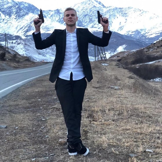 Cũng trong một tấm hình khác được đăng trên Instagram, anh chàng xuất hiện với vest đen, áo sơ mi trắng, đứng trước dãy núi Caucasus, giương 2 khẩu súng ngắn lên trời với câu bình luận: “Xin cảm ơn về lòng mến khách”.