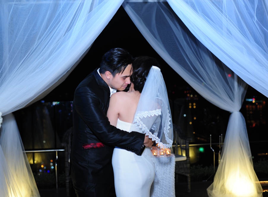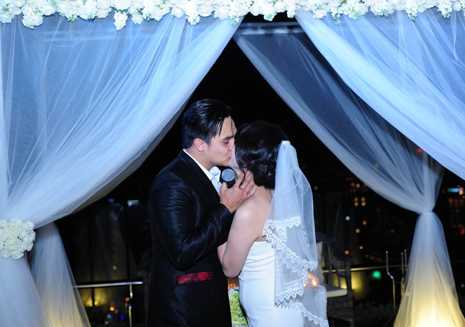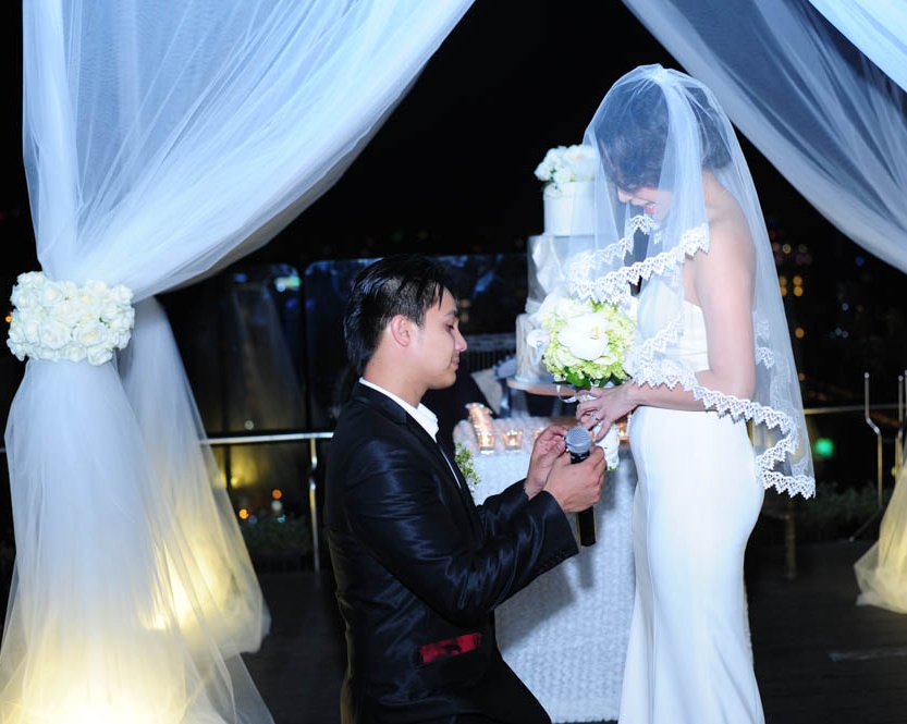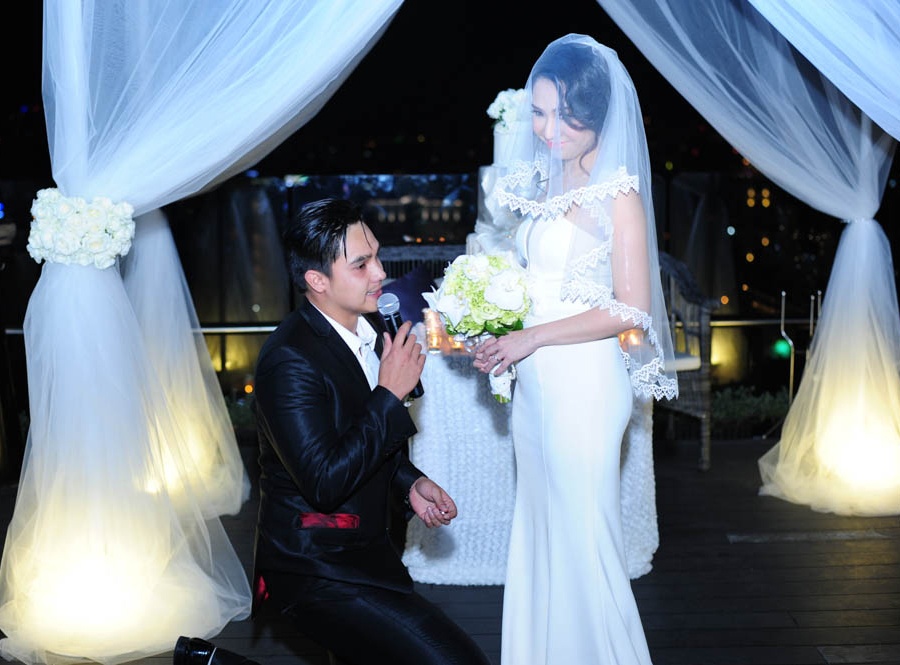 | Trong hôn lễ được tổ chức ngay tại quán bar và nhà hàng của gia đình, hot boy Baggio không ngần ngại quỳ gối trước mặt gia đình và bạn bè thân thiết để lồng chiếc nhẫn cưới vào tay Quỳnh Trâm. |