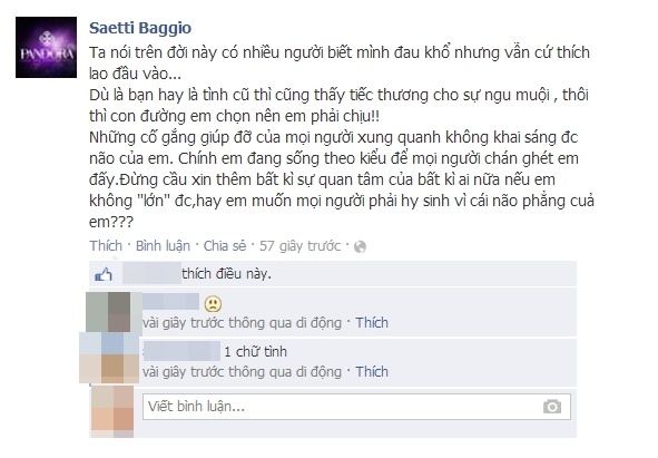 Sau khi đọc status mới nhất này của Baggio, người ta “đoán già đoán non” rằng chàng hot boy không mấy ủng hộ chuyện tình mới của bạn gái cũ, lại càng bất lực hơn sau nhiều lần khuyên ngăn, giúp đỡ nhưng Andrea vẫn không chịu nghe. Câu status này cũng như lời cuối cùng khẳng định sau này không còn muốn có bất kỳ sự giúp đỡ hay quan tâm nào tới Andrea nữa.