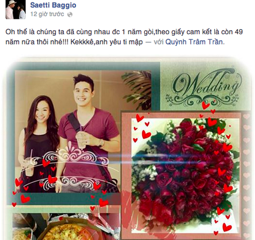 Hôm 7/8, Baggio đăng tải một hình ảnh kèm theo lời nhắn gửi tới bà xã: "Oh thế là chúng ta đã cùng nhau được 1 năm, theo giấy cam kết là còn 49 năm nữa thôi nhé! Anh yêu Ti mập".