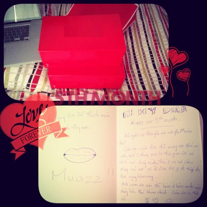 Trước đó, hai vợ chồng Baggio - Quỳnh Trâm vẫn còn rất vui vẻ bên nhau. Chiều 26/6, Quỳnh Trâm khoe trên trang cá nhân hình ảnh hộp quà và chiếc thiệp ông xã gửi tặng cô nhân dịp 5 tháng kết hôn cùng lời chia sẻ rất vui vẻ: "Hôm nay lão béo đi từ sớm rồi về nhà xách theo cái này! Thế là đã 5 tháng rồi! Cám ơn lão béo nhà mình". Trong thiệp, nam diễn viên Chạm tay vào nỗi nhớ dành cho vợ những lời đầy tình cảm. Anh viết: "Gửi người vợ thân yêu mà anh yêu nhất trên đời. Cám ơn cuộc đời đã mang em đến với anh, suốt 5 tháng qua là thời gian vất vả nhất của chúng mình. Nếu không có sự chịu đựng của em có lẽ hai ta đã không đi tiếp được đến ngày hôm nay... Anh cảm ơn em đã luôn ở bên anh vào những lúc khó khăn nhất. Cảm ơn em vì tất cả. Hy vọng em sẽ thích món quà anh tặng em".