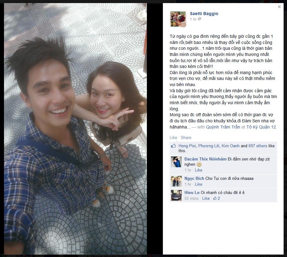 Mới đây, anh tiếp tục gửi tới vợ những lời đường mật trên trang cá nhân. Bagio tiết lộ luôn tự trách bản thân kém cỏi khi nhìn thấy vợ buồn tủi và rơi nước mắt vì mình: “Từ ngày có gia đình riêng đến bây giờ cũng được gần một năm rồi, biết bao nhiêu là thay đổi về cuộc sống cũng như con người... Một năm trôi qua cũng là thời gian bản thân mình chứng kiến người mình yêu thương nhất buồn tủi, rơi lệ vô số lần, mỗi lần như vậy tự trách bản thân sao kém cỏi thế”.