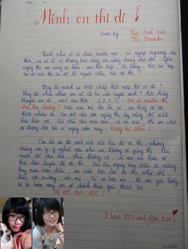 Mới đây, trên mạng xã hội xuất hiện bức ảnh chụp lời bài nhạc chế Mình ôn thi đi. Những ca từ ngộ nghĩnh, gắn liền với tâm trạng của các sĩ tử lớp 12 khiến bài hát được cải biên này nhanh chóng trở thành tâm điểm chú ý của giới trẻ