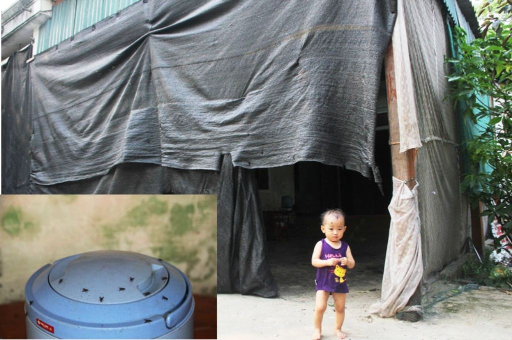 | Cách bãi rác chừng vài trăm mét, gia đình ông Nguyễn Văn Sơn (tiểu khu 10, khu phố Hưng Lợi) có 3 có thế hệ sinh sống trong nhà. Hàng ngày, từ người lớn tới trẻ nhỏ đều phải hít không khí độc hại từ bãi rác gây ra. Và để tránh ruồi, nhặng, gia đình ông Sơn phải dùng bạt phủ kín ngôi nhà. |