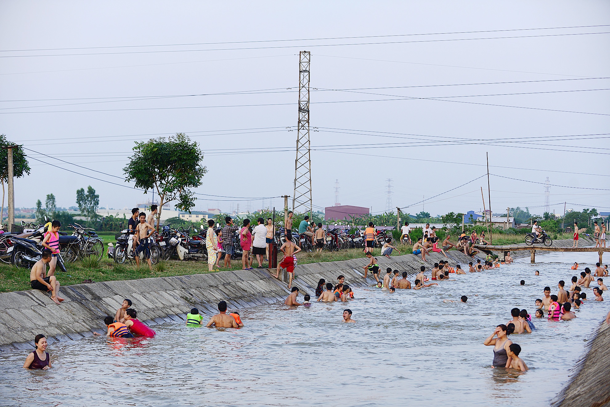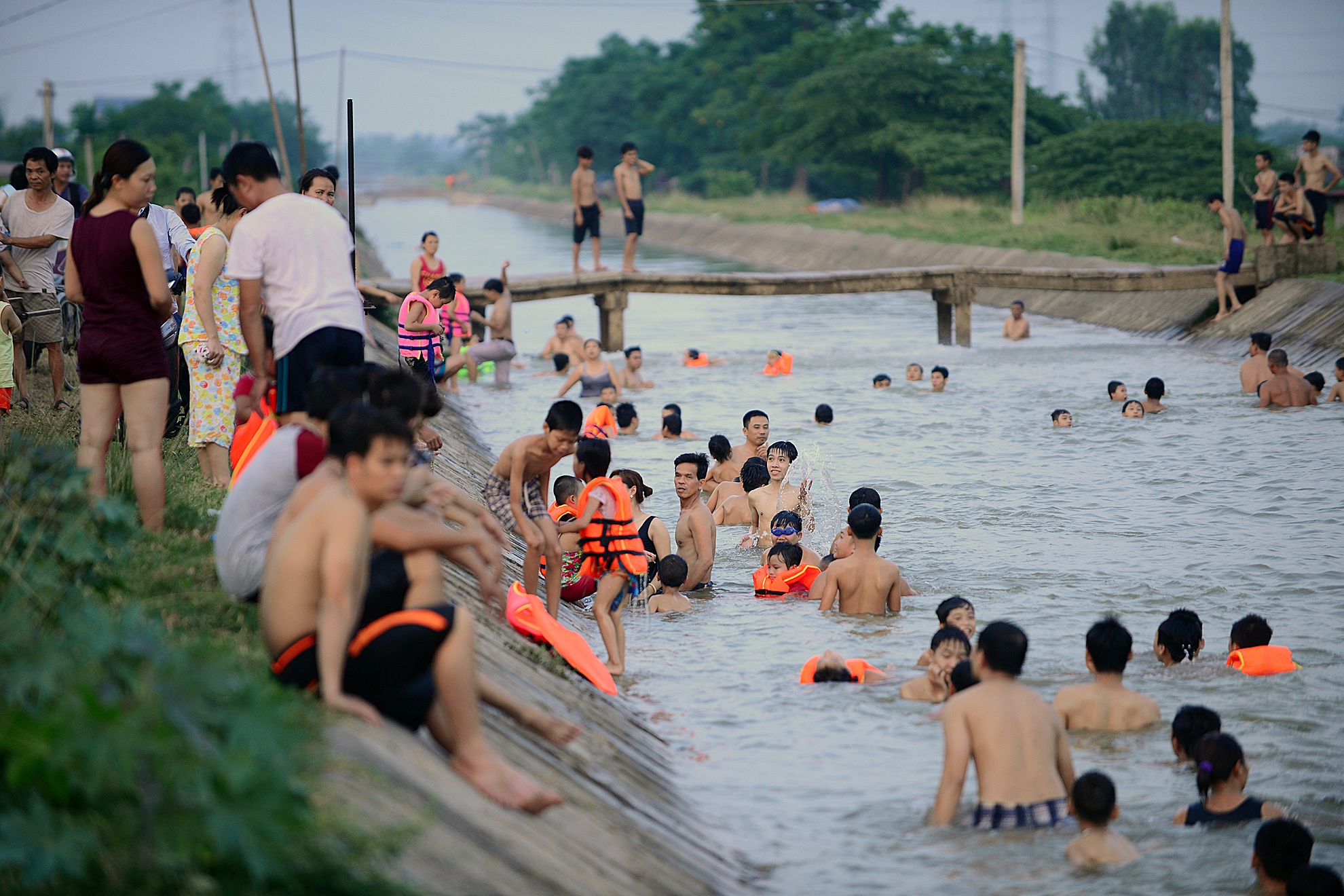 14h chiều là thời điểm người dân đổ ra khu vực này đông nhất. Đợt nóng kỷ lục 40 độ C cách đây ít tuần từng khiến con mương đông nghịt người.
