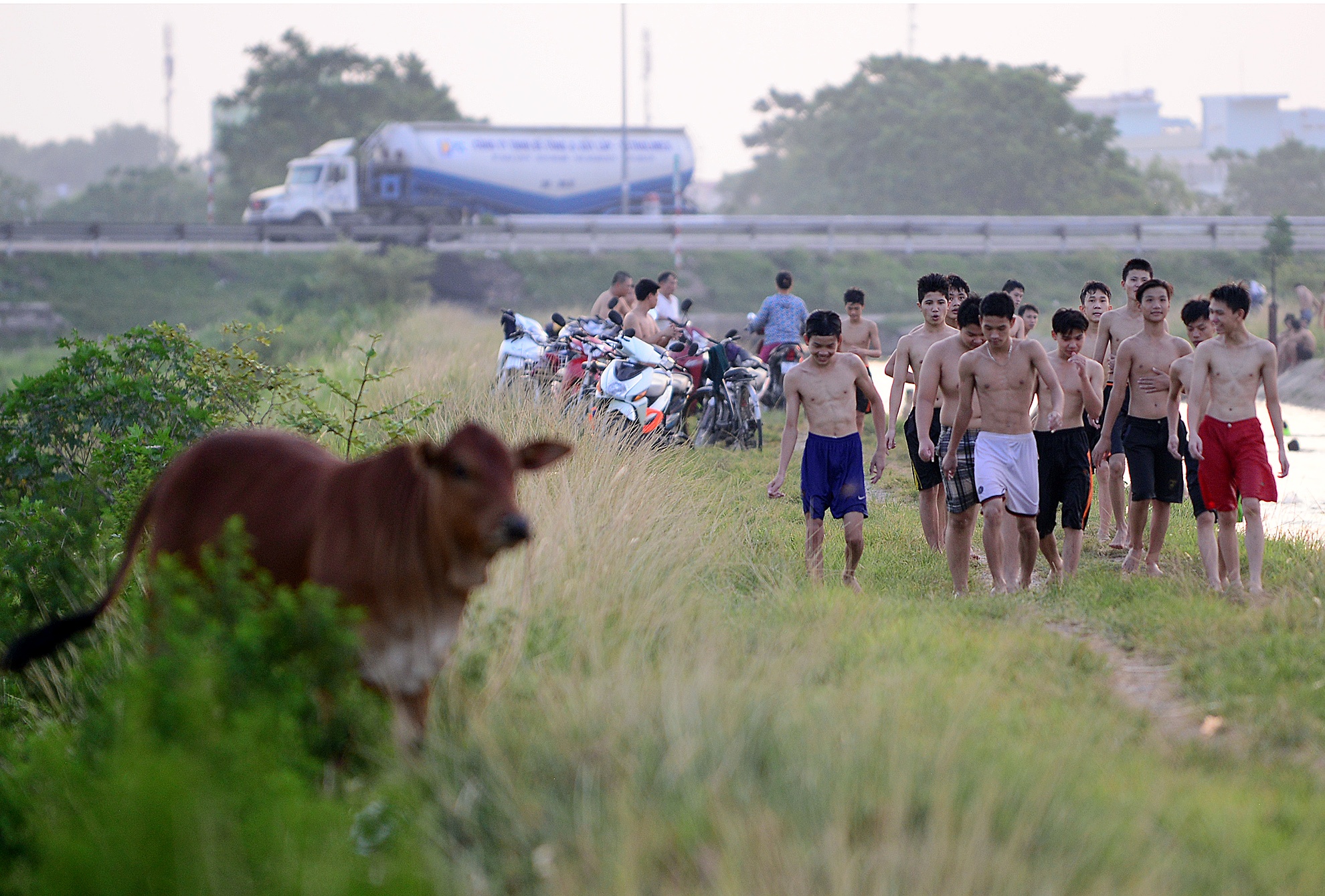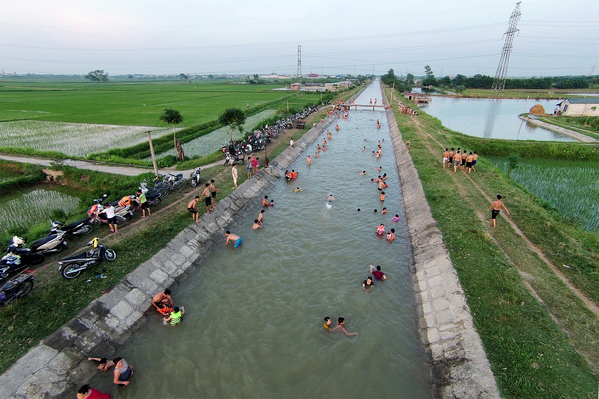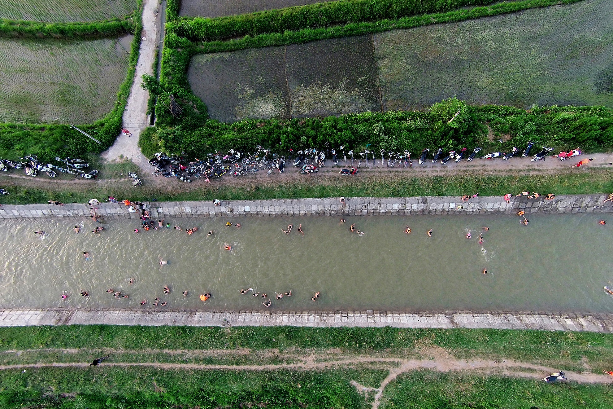 Mỗi buổi chiều, người dân làng Hạ Thái (Thanh Trì, Hà Nội) lại đổ ra mương nước phục vụ nông nghiệp để tắm mát. Có thời điểm, bãi tắm dài nhiều km này chật kín người.