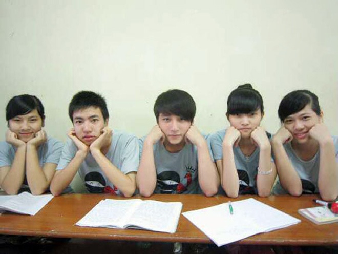 | Sơn Tùng M-TP (ngồi giữa) chụp ảnh cùng các bạn trong lớp khi còn đi học cấp 3 tại THPT Lê Quý Đôn, Thái Bình. Ảnh: NVCC. |