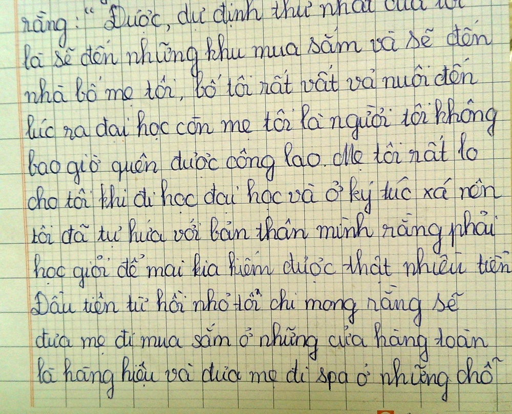 Em trả lời rằng: “Được, dự định thứ nhất của tôi là sẽ đến những khu mua sắm và sẽ đến nhà bố mẹ tôi, bố tôi rất vất vả nuôi đến lúc ra đại học còn mẹ tôi là người tôi không bao giờ quên được công lao. Mẹ tôi rất lo cho tôi khi đi học đại học và ở ký túc xá nên tôi tự hứa với bản thân mình rằng phải học giỏi để mai kia kiếm được thật nhiều tiền.