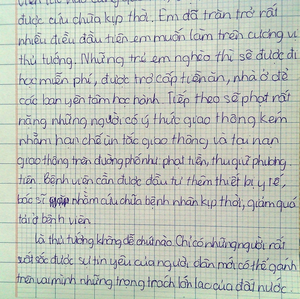 Bảo Anh (học sinh lớp 5A2) viết: “Em đã trăn trở rất nhiều điều đầu tiên em muốn làm trên cương vị thủ tướng. Những trẻ em nghèo sẽ được đi học miễn phí, được trợ cấp tiền ăn, nhà ở để các bạn yên tâm học hành. Tiếp theo sẽ phạt rất nặng những người có ý thức giao thông kém nhằm hạn chế ùn tắc giao thông và tai nạn giao thông trên đường phố như phạt tiền, thu giữ phương tiện. Bệnh viên cần được đầu tư thêm thiết bị y tế, bác sĩ nhằm cứu chữa bệnh nhân kịp thời, giảm tải ở bệnh viện”.