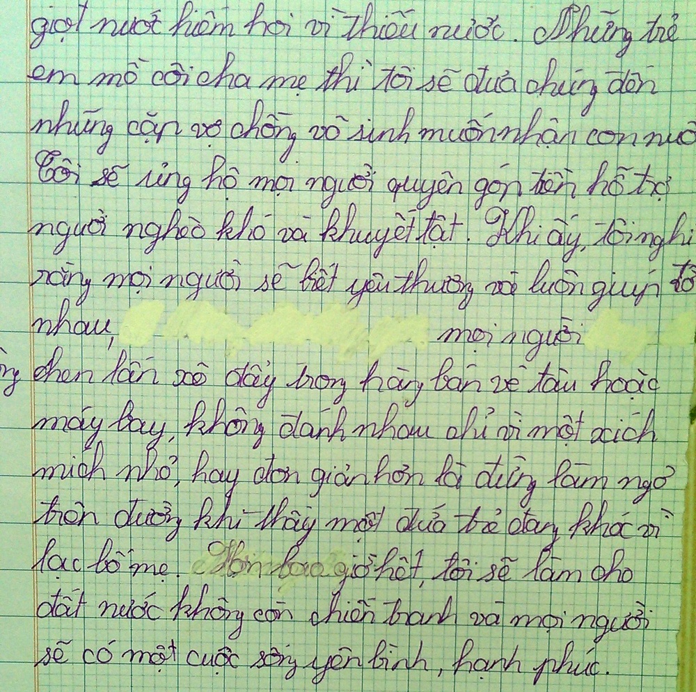 Dự định cuối cùng của tôi là tôi sẽ xây riêng một ngôi trường với 80 tầng. Nó sẽ có kiến trúc đẹp vì nó sẽ là trường quốc tế America. Và sẽ có một ngôi trường ở gần cô nhi viện để cho những em nghèo không đủ điều kiện để đi học sẽ vào đó và được học, ăn miễn phí. Và em sẽ mua sữa, bánh, mỳ tôm… để quyên góp từ thiện”. Khi nói xong cũng là lúc em bừng tỉnh giấc em rất vui khi mơ một giấc mơ thật tuyệt vời”.