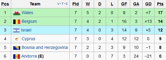 Sau 7 trận ở bảng B vòng loại EURO 2016, Gareth Bale cùng đồng đội hiện bất bại. Họ thắng 5 và hòa 2, qua đó xếp trên ĐT Bỉ với 3 điểm nhiều hơn.