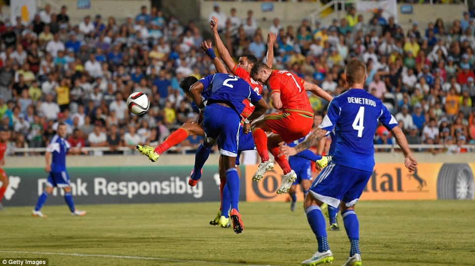 Bale đánh đầu lập công cho ĐT xứ Wales ở phút 82 trong trận vượt qua Đảo Síp 1-0, qua đó giữ vững ngôi đầu bảng B vòng loại EURO 2016 với 17 điểm sau 7 trận.