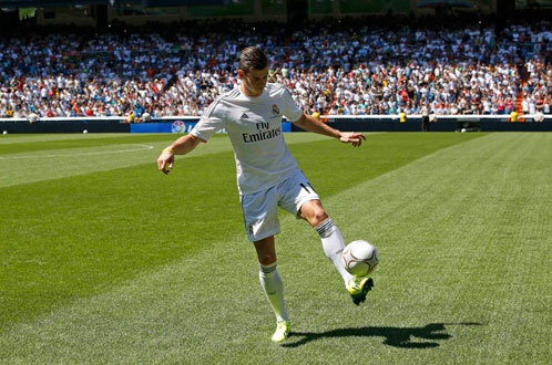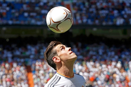 | Bale tâng bóng trong buổi ra mắt tại Bernabeu - Ảnh: Reuters. |