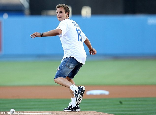 | Tiền đạo Mario Goetze tham dự trận đấu bóng chày giữa Los Angeles Dodgers và New York Mets. Ngôi sao 23 tuổi người Đức sẽ hội quân cùng Bayern Munich vào tuần tới để chuẩn bị cho mùa giải mới. |