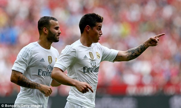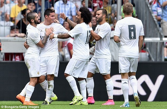 | Phút 36, Real Madrid có bàn mở tỷ số. James Rodriguez là cầu thủ lập công cho đội bóng Hoàng gia bằng một pha đánh đầu đẹp mắt. |