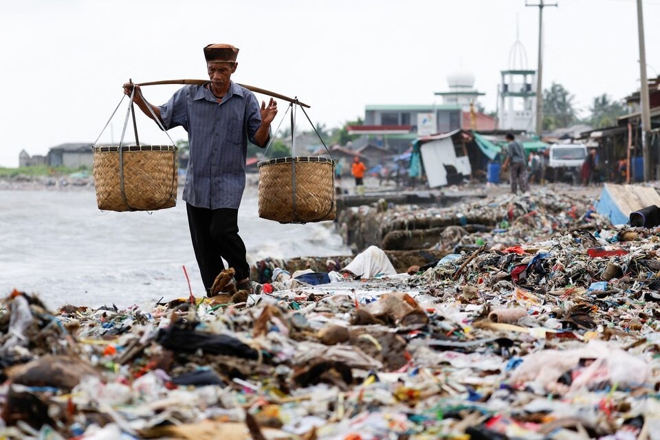 Một người đàn ông mang giỏ đi giữa những đống rác, phần lớn là rác thải nhựa và rác sinh hoạt, trên một bãi biển ở làng chài thuộc tỉnh Banten, Indonesia. |