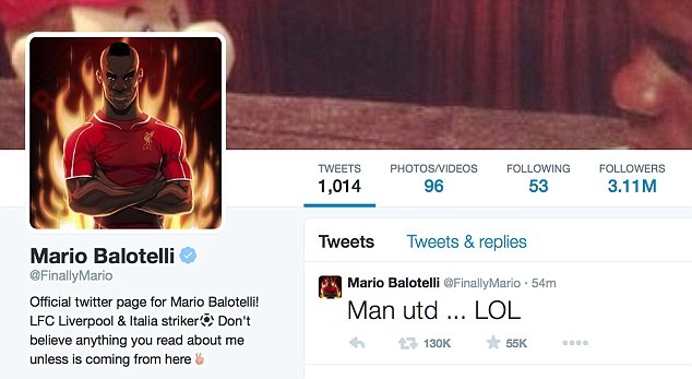 Ngay sau trận thua bất ngờ 3-5 của M.U trước Leicester City, tiền đạo Mario Balotelli đăng lên tài khoản Twitter nội dung: “Man Utd… LOL (Laugh out loud – cười hết cỡ)” với hàm ý chế giễu thất bại xấu hổ của Quỷ đỏ. Dòng tweet của Super Mario nhanh chóng nhận được sự quan tâm của đông đảo người hâm mộ.