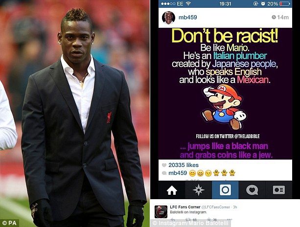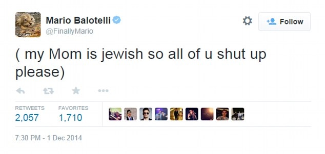 | Ức chế vì những lời chỉ trích cho rằng mình xúc phạm người Do Thái, Balotelli xóa bức ảnh trên và đáp trả bằng một dòng trạng thái trên Twitter: "Mẹ tôi cũng là người Do Thái nên tất cả hãy ngậm miệng lại". |