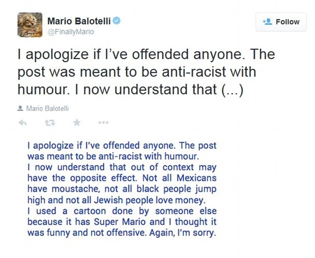 | Tuy nhiên, cuối cùng tiền đạo đang khoác áo Liverpool cũng xóa dòng trạng thái trên và thay bằng lời xin lỗi vào sáng thứ 3. Anh khẳng định những nội dung mình viết đều mang ý nghĩa chống phân biệt chủng tộc chứ không có ý gì khác. Tuy nhiên, nếu LĐBĐ Anh (FA) vào cuộc điều tra, rất có thể Balotelli sẽ phải nhận án phạt treo giò lên đến 5 trận. |