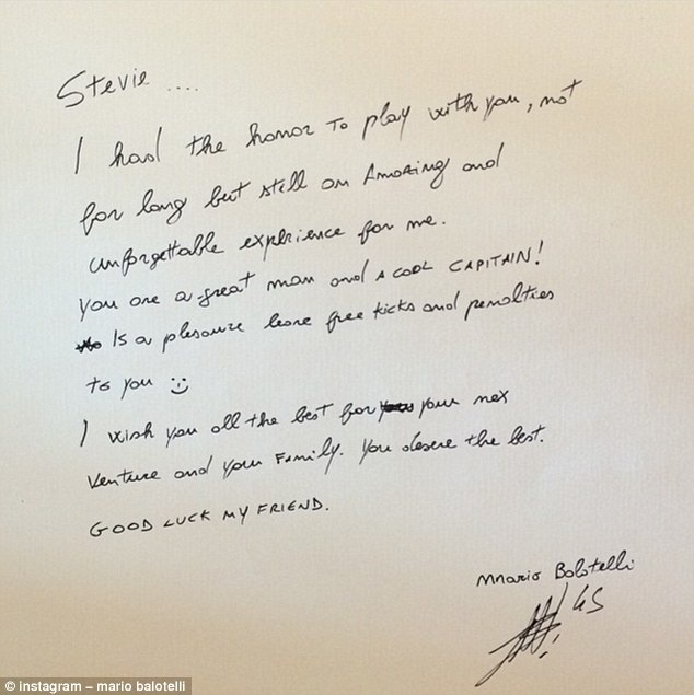 Trước cuộc đối đầu với Crystal Palace thuộc vòng 37 Premier League, trận đấu chia tay Steven Gerrard trên sân Anfield, tiền đạo Italy viết thư gửi tới cựu thủ quân tuyển Anh. Trong thư, Balorelli thể hiện tình cảm của mình và chúc cựu thủ quân tuyển Anh gặt hái thành công trong tương lai.