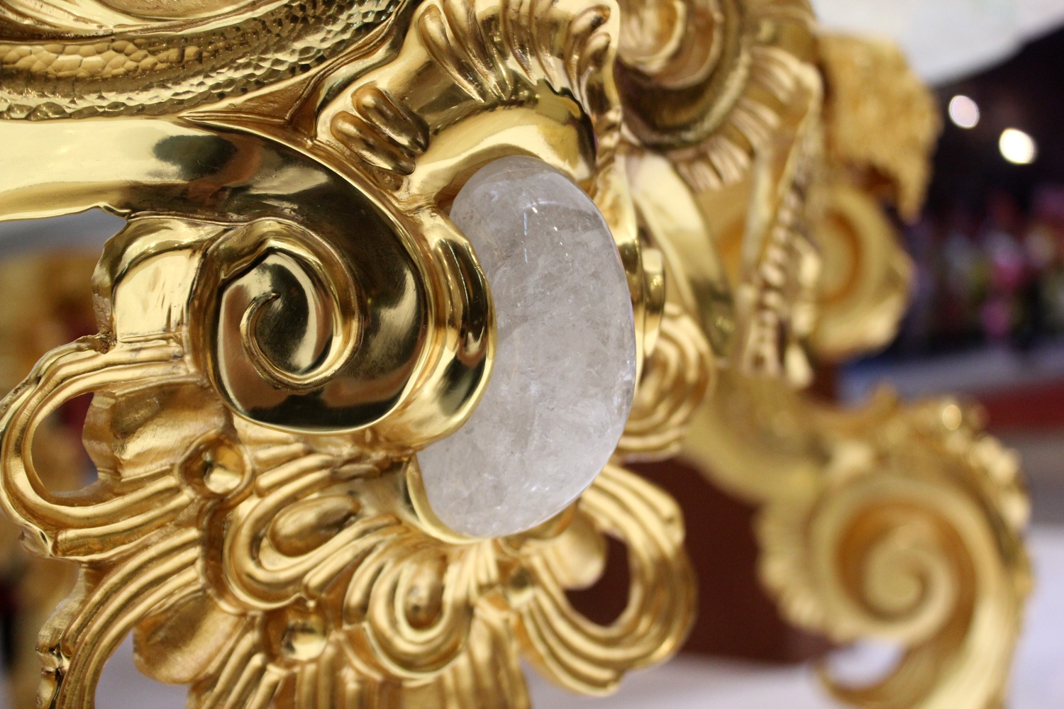| Chân bàn là 10 tượng thần Vệ nữ khảm vàng. Một khách hàng (giấu tên) ở Sài Gòn cho biết: “Chiếc bàn bằng ngọc này có kích thước, hình dáng phù hợp với những căn biệt thự phong cách Tây". Tuy nhiên, theo ông, ngoài giá cả, nếu là người mua, ông còn quan tâm đến vấn đề phong thủy như màu sắc, kiểu dáng có hợp mệnh chủ nhân hay không. |