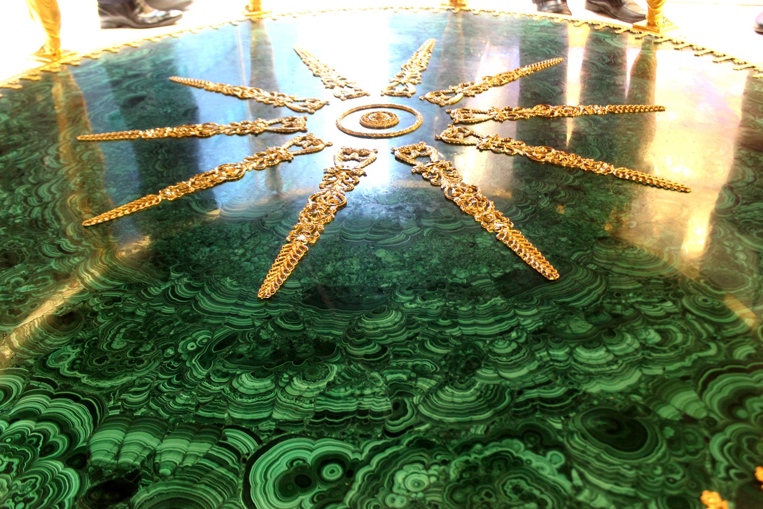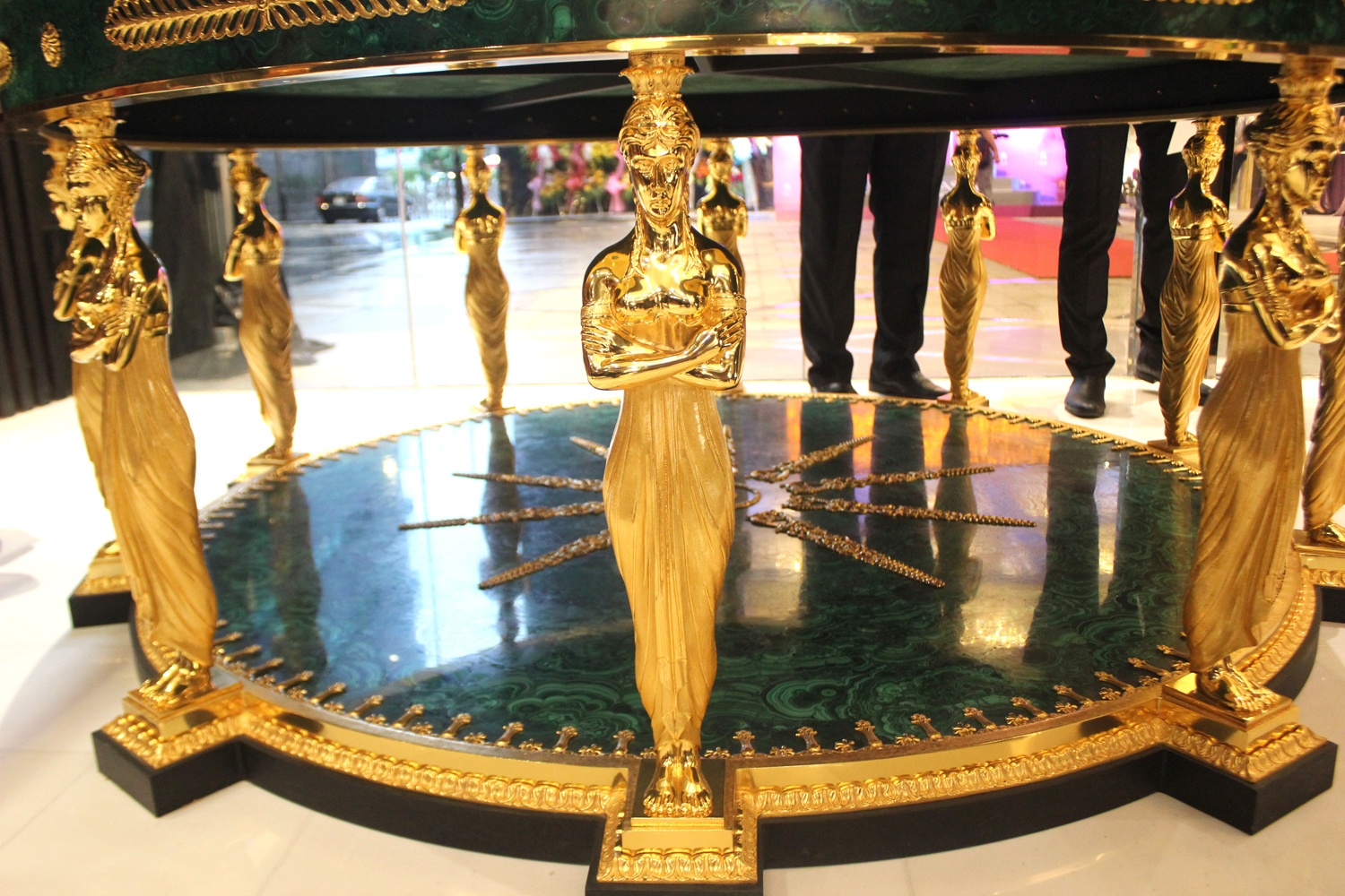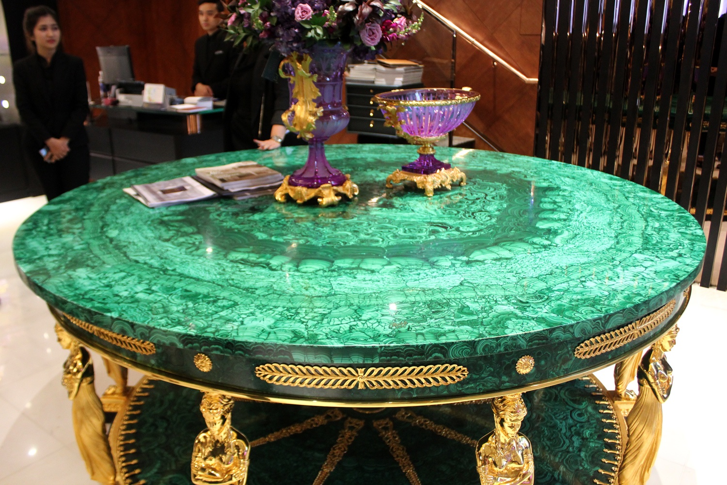 | Chiếc bàn thứ hai được làm bằng đá màu xanh ngọc mang phong cách Hoàng gia Nga. Giá chào bán sản phẩm này cũng trên 8 tỷ đồng. |