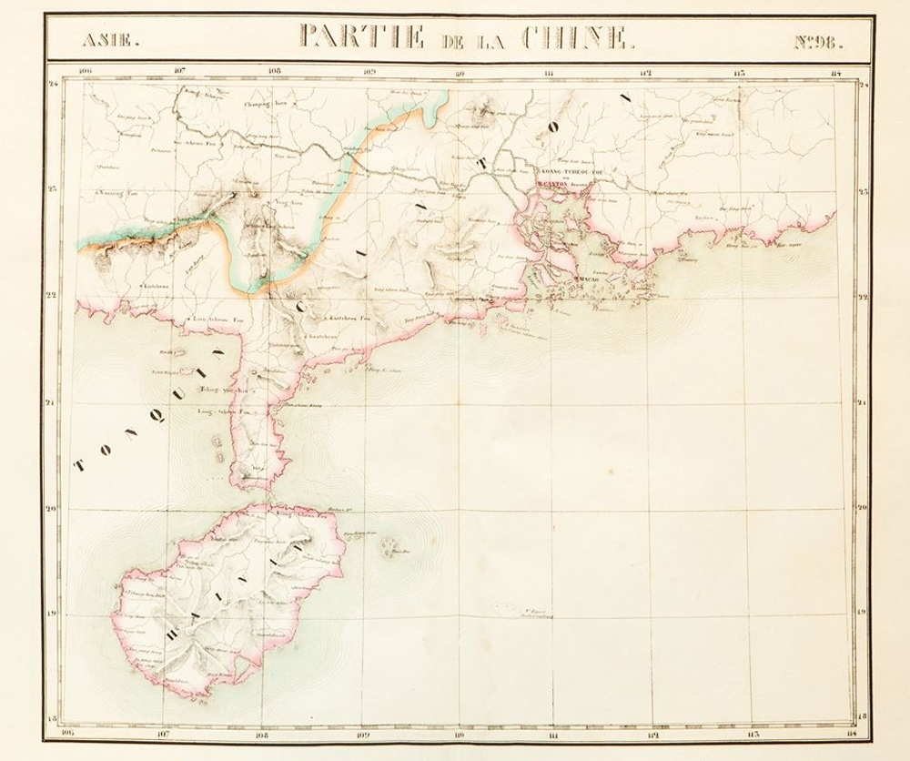 | Tấm bản đồ Partie de la Chine trong khoảng vĩ độ 18 - 21 và kinh độ 106 - 114 vẽ khu vực Quảng Đông và đảo Hải Nam, cho biết biên giới cực nam của Trung Quốc chưa chạm đến vĩ độ 18. Ảnh: Trịnh Văn Đức. |