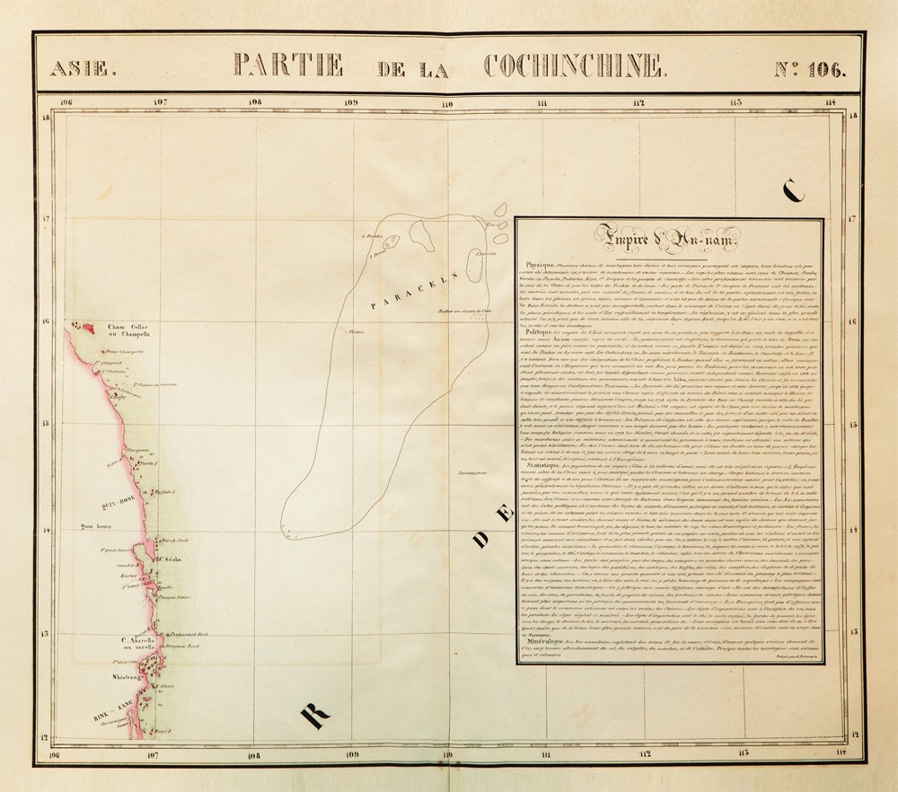 Quan trọng nhất trong số này là bản đổ Partie de la Cochinchine (tờ 106) vẽ đường bờ biển miền Trung từ vĩ tuyến 12 đến vĩ tuyến 16. Phía ngoài khơi Paracels (Hoàng Sa) được vẽ khá chi tiết và chuẩn xác trong khoảng từ vĩ độ 16 đến 17 và kinh độ từ 109 đến 111. Paracels có các đảo Pattles, Ducan ở phía tây; Tree và Lincoln, Rocher au desu de l’eau (bãi đá ngầm) ở phía đông và Triton ở phía tây nam, ngay dưới vĩ độ 16.