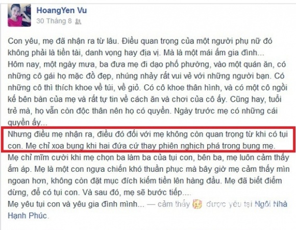 Mẹ chỉ mỉm cười khi mẹ chọn ba làm ba của tụi con, bên ba, mẹ luôn cảm thấy ấm áp. Mẹ là một con ngựa chiến khó thuần phục mà bây giờ mẹ cảm thấy mình ngoan hơn, không còn đặt mục đích kiếm tiền lên hàng đầu. Mẹ đã biết điểm dừng, để có tụi con. Và sau đó, mẹ sẽ bước tiếp... Mẹ yêu tụi con và yêu gia đình mình…”.