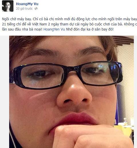 Hoàng My đang ở Mỹ tập trung cho khóa học làm đạo diễn cũng tranh thủ về Việt Nam 2 ngày để dự ngày vui của chị gái mình. Trên trang cá nhân, Á hậu Việt Nam 2010 viết: “Ngồi chờ máy bay. Chỉ có bà chị mình mới đủ động lực cho mình ngồi chờ 21 tiếng trên máy bay chỉ để về Việt Nam 2 ngày tham dự cái ngày bỏ cuộc chơi của bà. Không có lần sau đâu bà ngoại, nhớ đón tôi ở sân bay đó”.