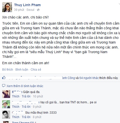 Mới đây, bạn gái của Trương Nam Thành – người mẫu Thùy Linh - đăng tải đoạn chia sẻ về chuyện tình cảm hiện tại. Theo đó, người đẹp và top 10 Mr. World 2012 quyết định chia tay sau hơn một năm yêu nhau.