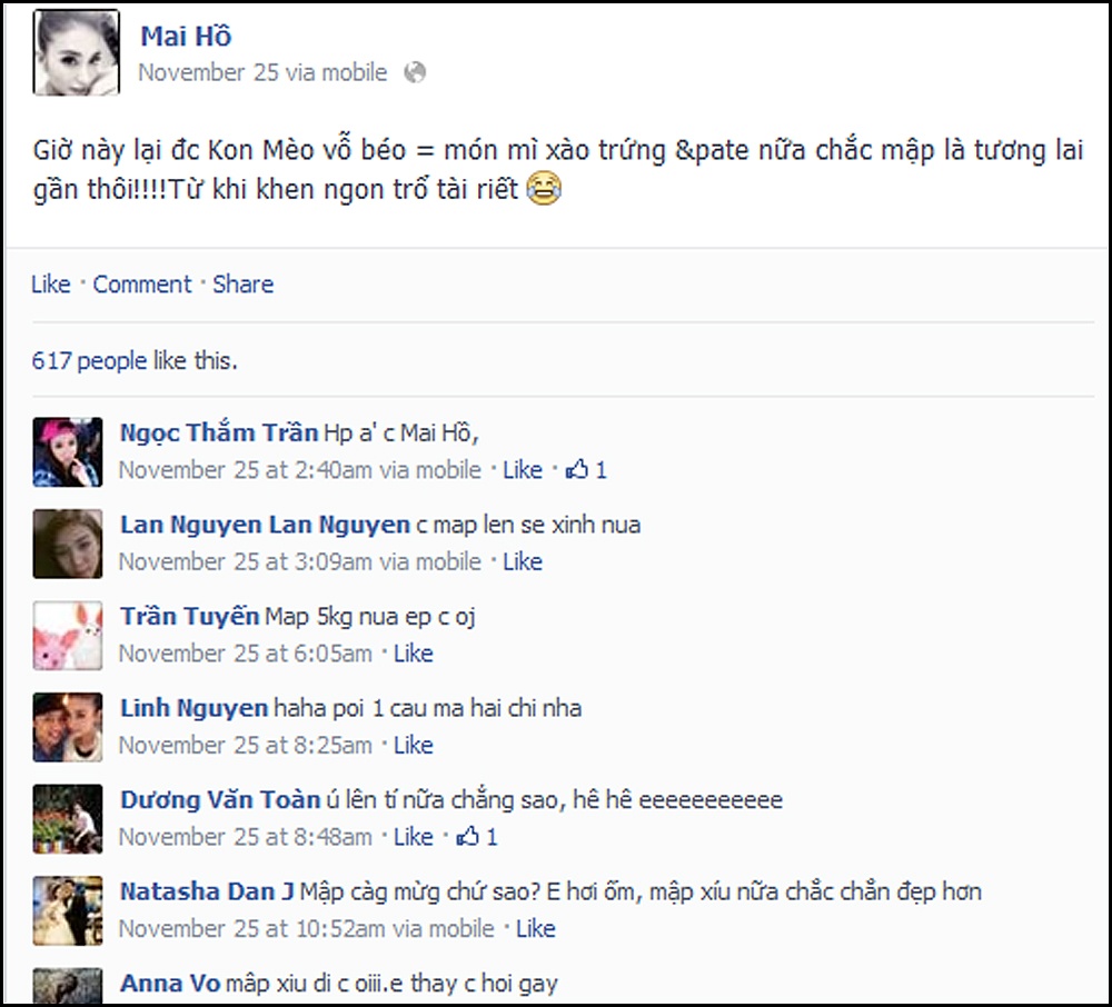 | Mai Hồ từng chia sẻ về những phút thảnh thơi bên nhau của mình và bạn trai: "Yêu những lúc bình yên,yên ả này! Không phải bận rộn, thong thả dạo chơi, chẳng cần make up, đi giầy bệt và thích nhất là đi dép... Tóm lại là đơn giản nhất có thể và thích đi ăn hàng kể cả từ tiệm cho đến vỉa hè miễn được ăn món mình thích... Ung dung đi xem phim hay rủ bạn bè đi chung để tán gẫu sự đờ... Một ngày không quá bận rộn thật hiếm hoi nên có được mới thấy ý nghĩa với chúng ta". |