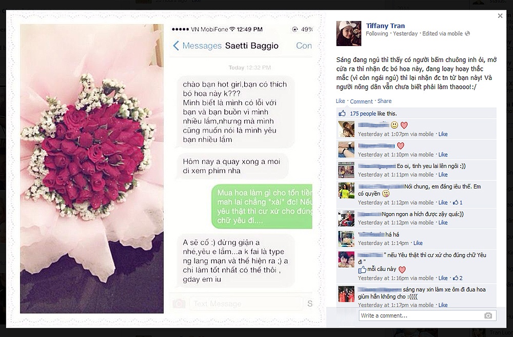 Cô nàng cũng tâm sự với bạn bè và người theo dõi trên trang cá nhân rằng: "Sáng đang ngủ thì thấy có người bấm chuông inh ỏi, mở cửa ra thì nhận được bó hoa này, đang loay hoay thắc mắc (vì còn ngái ngủ) thì lại nhận đc tin nhắn từ bạn này! Và người nông dân vẫn chưa biết phải làm sao?".