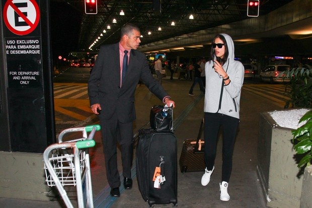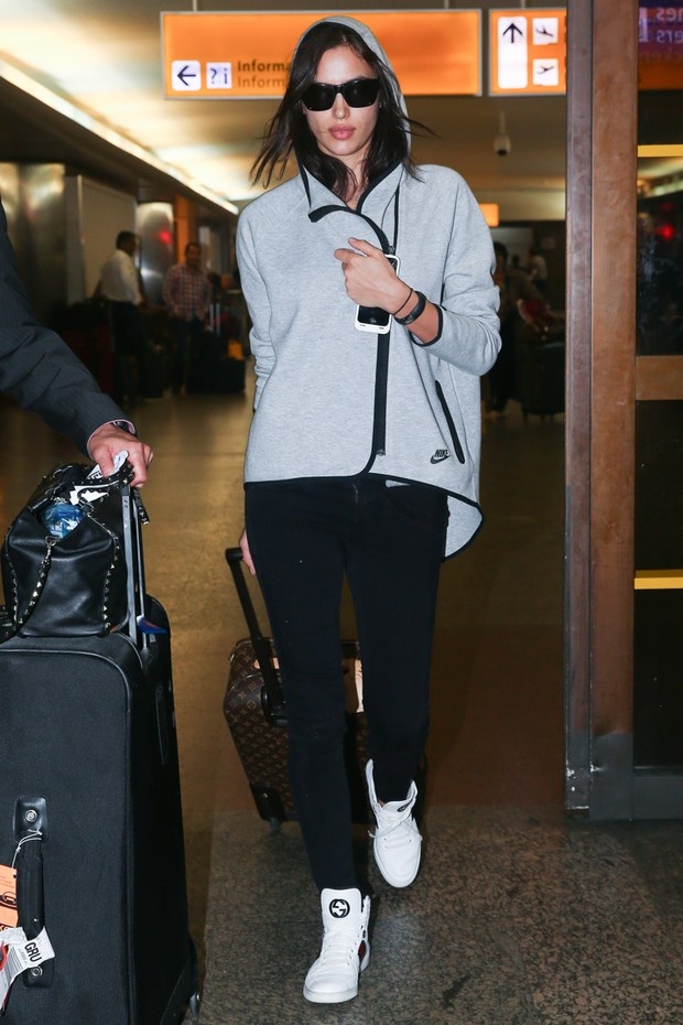 Khác xa với hình ảnh sexy, gợi cảm thường thấy, siêu mẫu Irina bất ngờ đeo kính đen, chụp mũ kín đầu để người hâm mộ không phát hiện khi đặt chân tới Sao Paulo, Brazil.