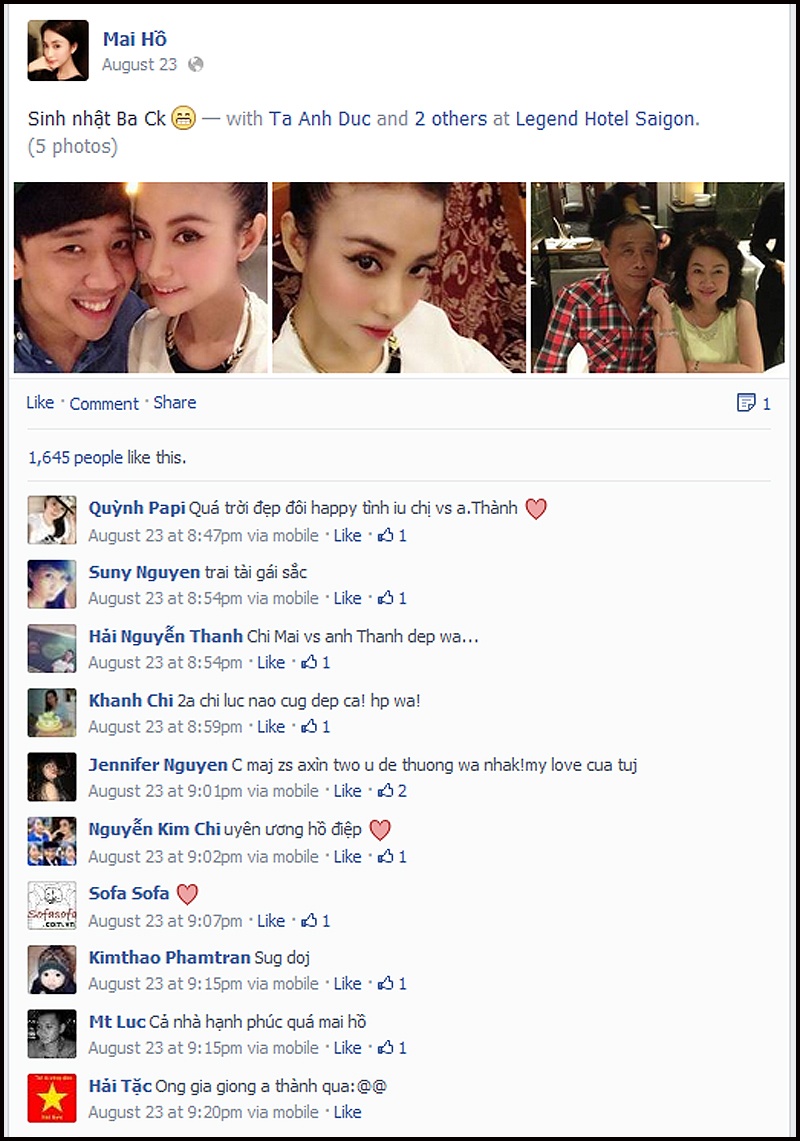 Trong bữa tiệc sinh nhật ba, cặp trai tài gái sắc bên nhau rất tình cảm. Bạn gái Trấn Thành vừa hoàn thành vai diễn bộ phim truyền hình do chị họ là Mai Thu Huyền sản xuất. Bộ phim này còn có sự góp mặt của nhiều tên quen thuộc trong làng giải trí như ca sĩ Pha Lê, Cao Mỹ Kim...