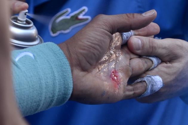 Trận đấu tạm dừng, bởi Nadal đã phải nhờ đến sự chăm sóc của các nhân viên y tế do vết thương ở bàn tay trái tái phát.