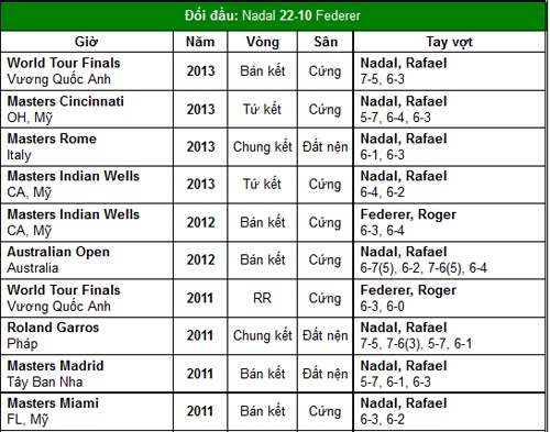 Thành tích đối đầu trong 10 trận gần nhất giữa Nadal và Federer.