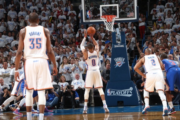 | Russell Westbrook trở thành người hùng của đội chủ nhà khi thực hiện thành công cả 3 cú ném phạt khi trận đấu chỉ còn vài giây. 3 điểm có được giúp Thunder thắng nghẹt thở 105-104 trước Clippers. |
