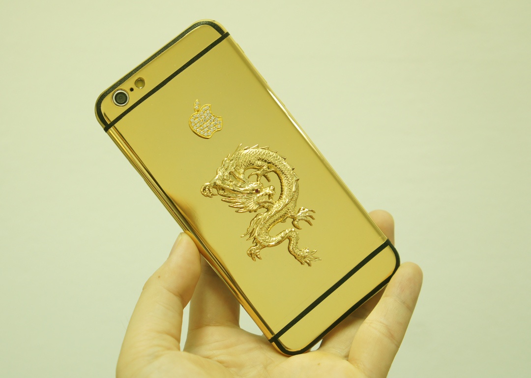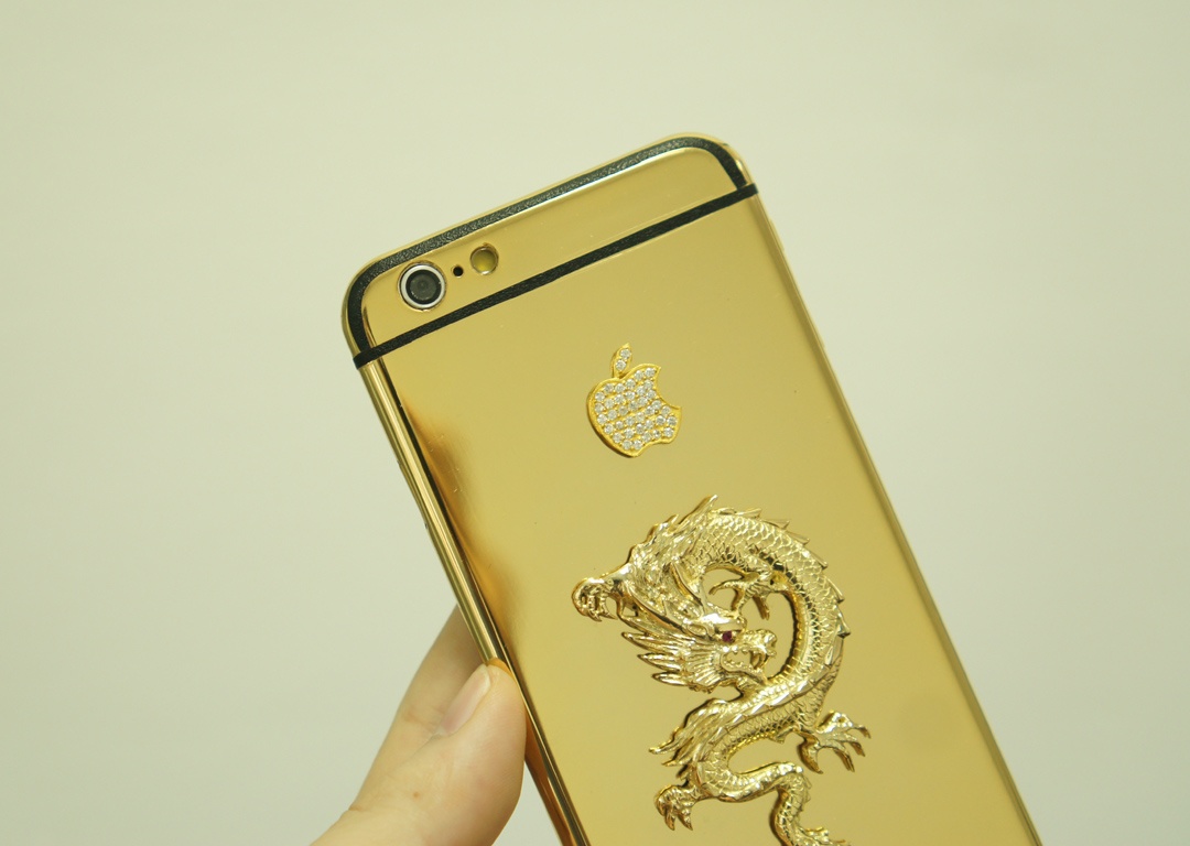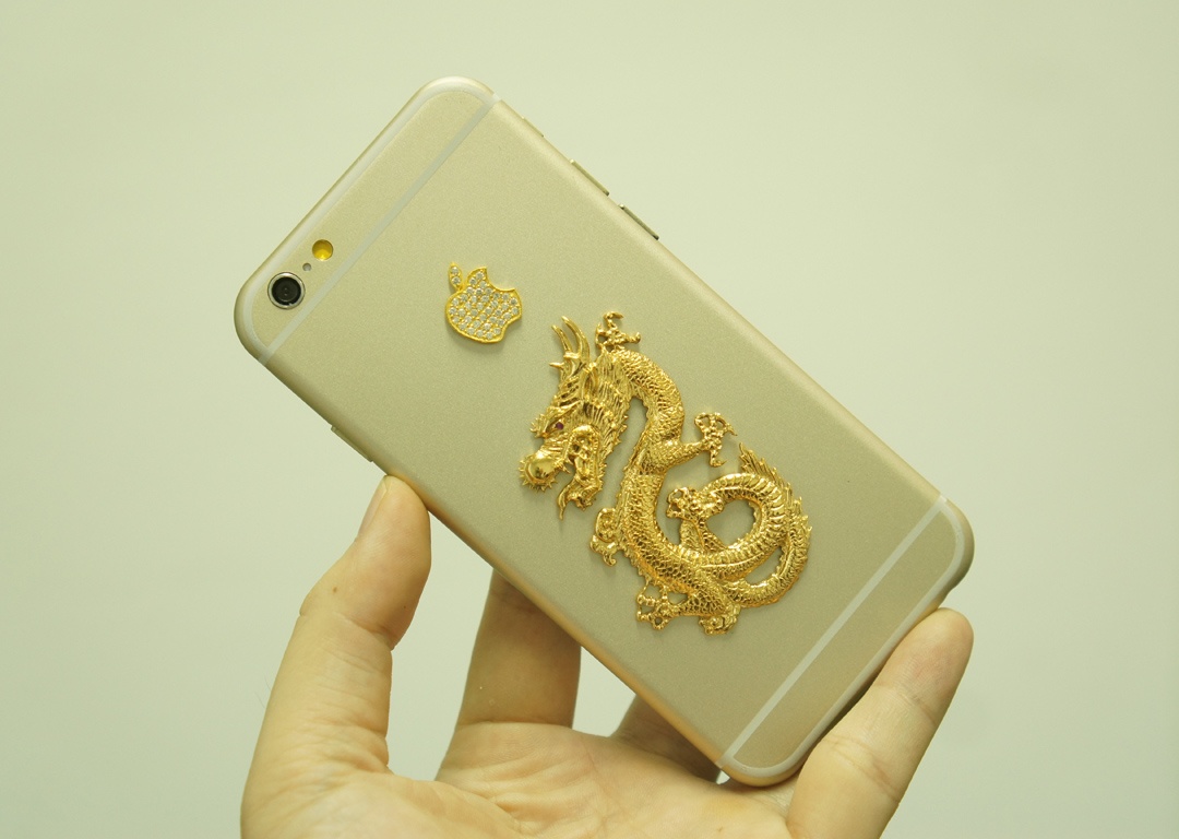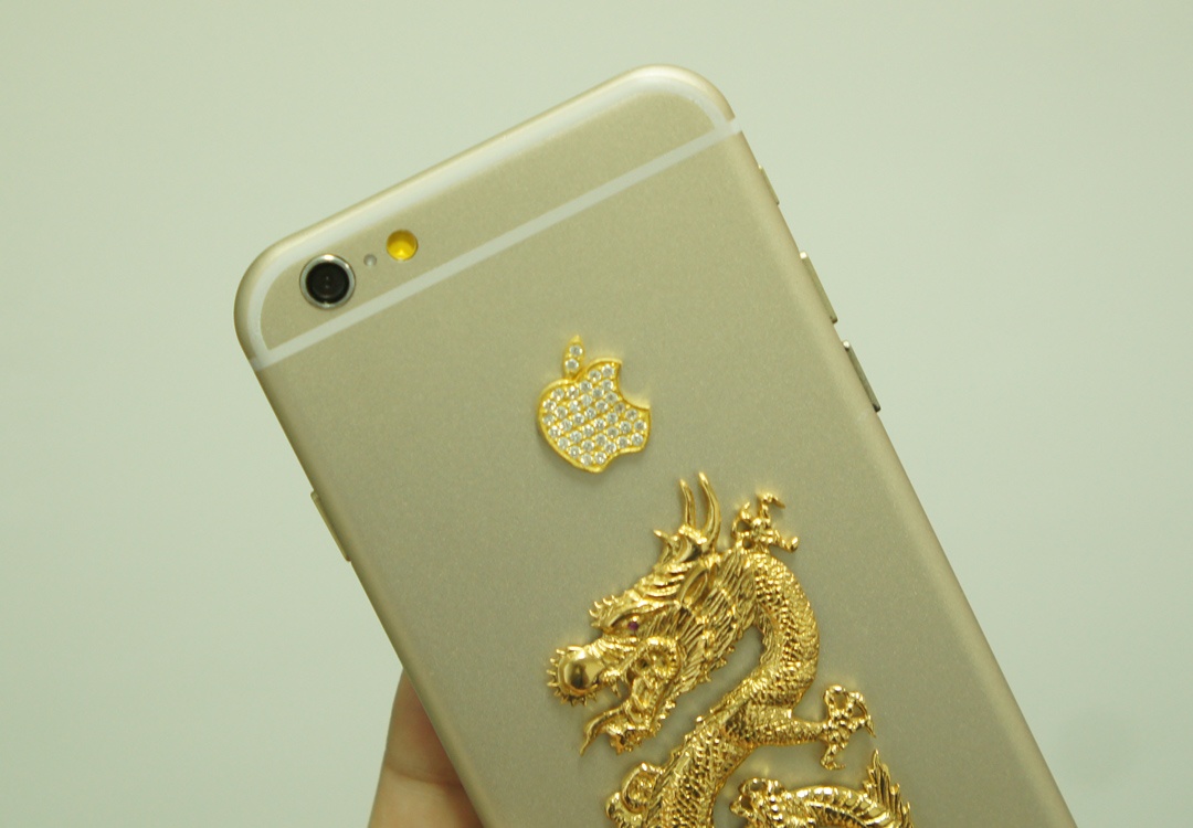 Mẫu iPhone 6 mô hình này có vỏ mạ vàng, logo táo khuyết đính đá nhân tạo và biểu tượng rồng ở mặt sau.
