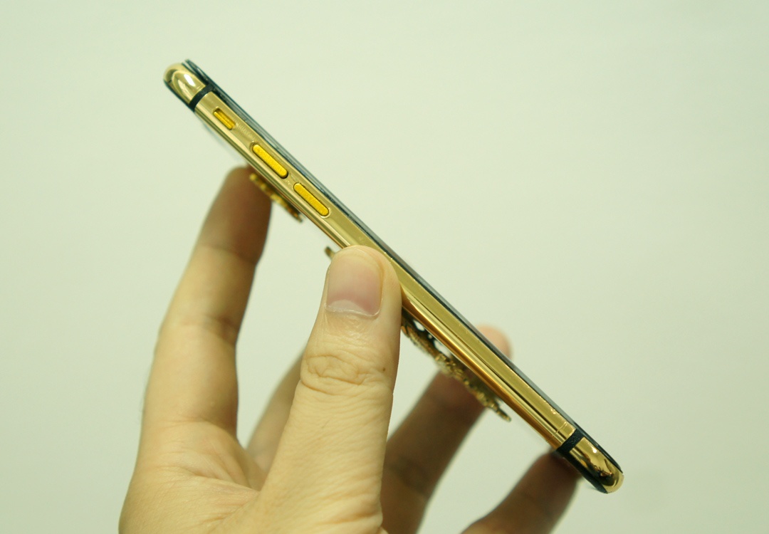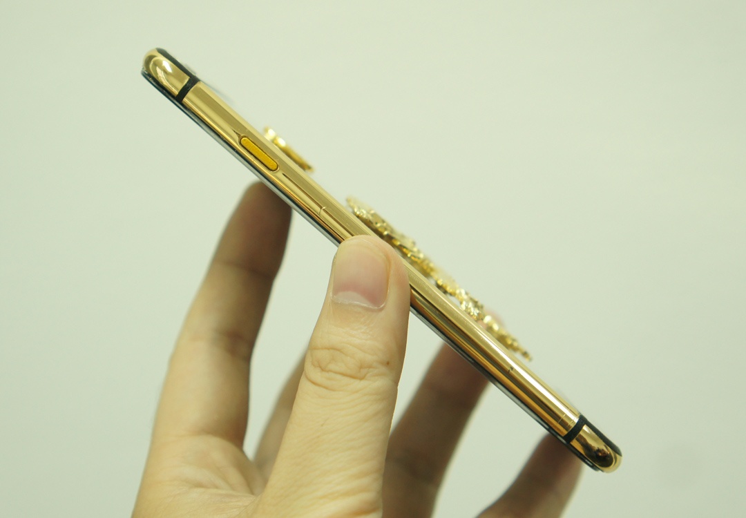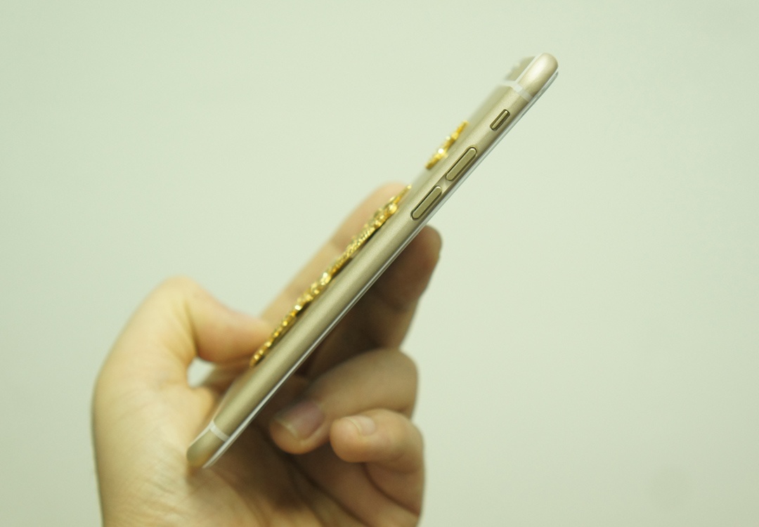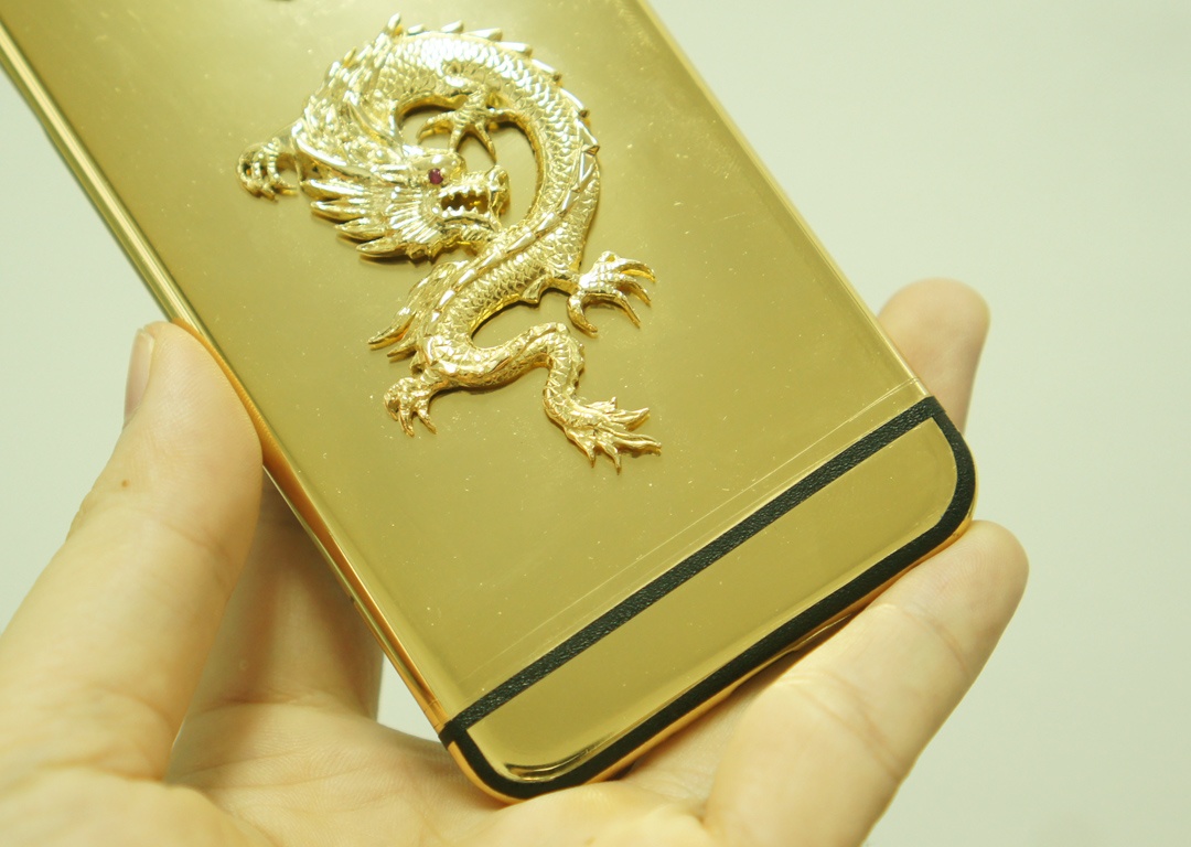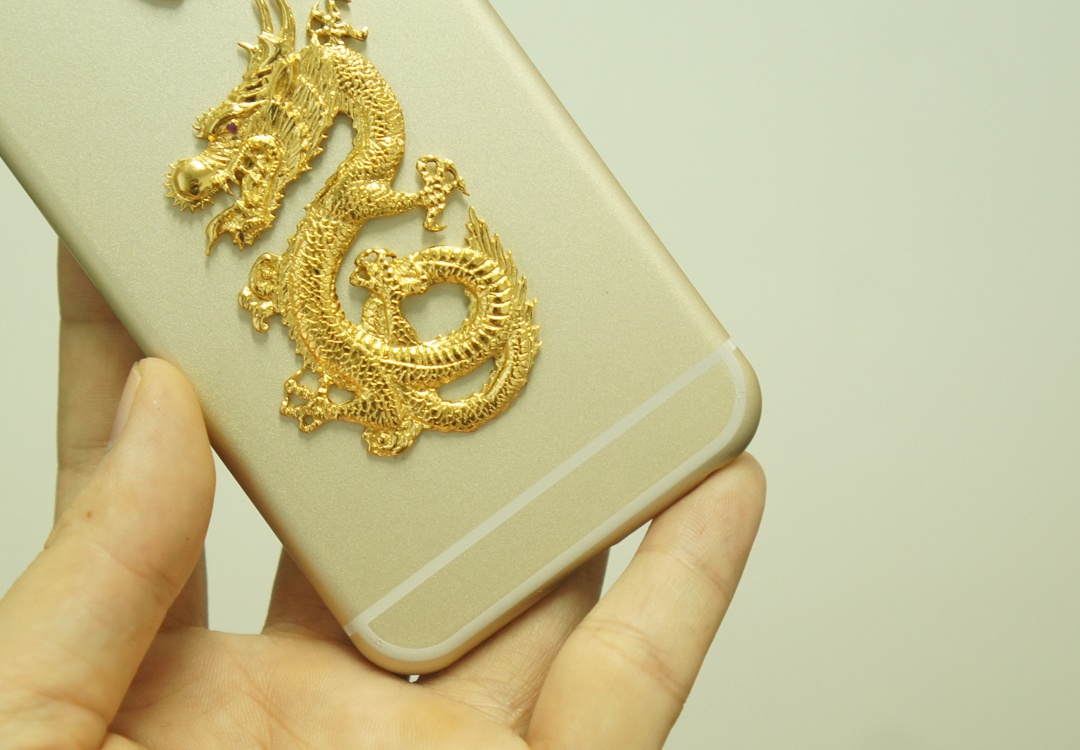 Mẫu iPhone 6 mô hình này có vỏ mạ vàng, logo táo khuyết đính đá nhân tạo và biểu tượng rồng ở mặt sau.