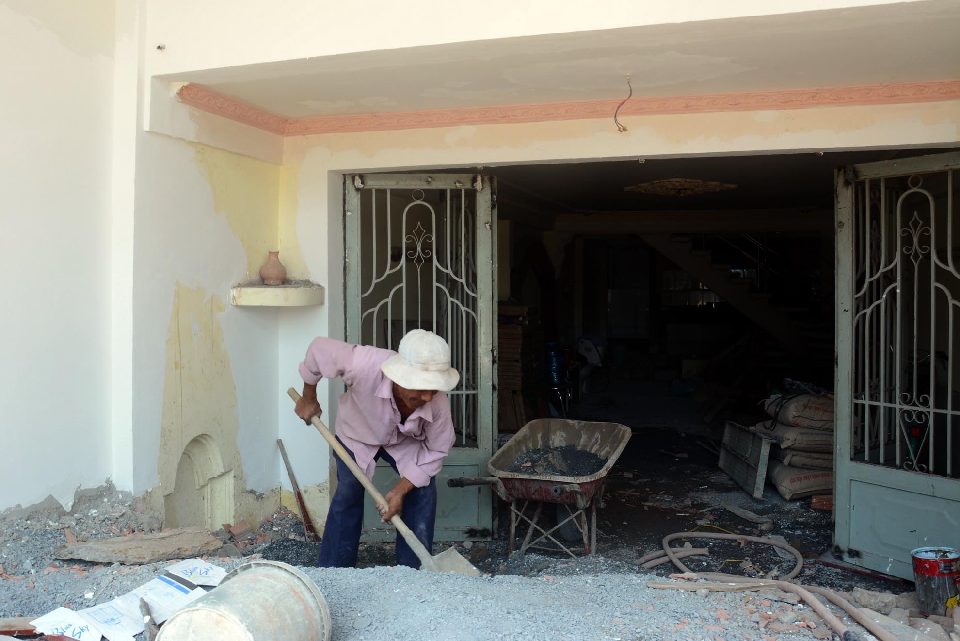 | Đang sửa lại căn nhà thấp hơn đường 1,5 m, ông Nguyễn Văn Thịnh cho biết, chính quyền chỉ cho sửa theo hiện trạng. Phần dưới ông làm thành hầm để đồ còn phần trên dùng để ở. Tuy không sửa nhiều nhưng chi phí cũng gần 100 triệu đồng. |