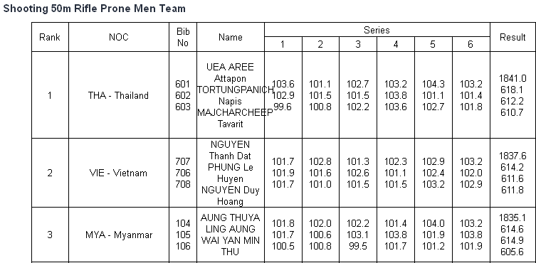 9h30 sáng nay (11/12), tại trường bắn Bắc Dagon, Yangon, môn bắn súng đã bắt đầu khởi tranh. Ở nội dung đồng đội 50 m súng trường nằm bắn, ĐT bắn súng Việt Nam với 3 VĐV Nguyễn Duy Hoàng, Phùng Lê Huyên, Nguyễn Thành Đạt đã giành HCB với số điểm 1837,6. Thái Lan giành HCV với số điểm 1841,0. Nước chủ nhà Myanmar đứng thứ 3 với số điểm 1835,1.