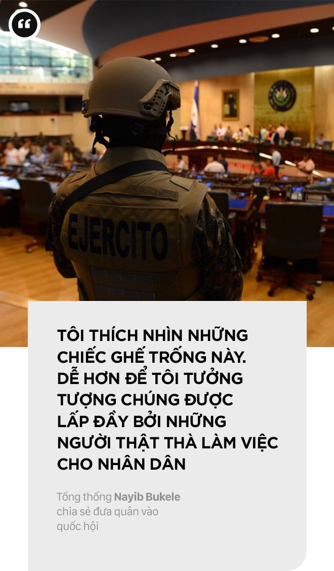 Tín hiệu cảnh báo đầu tiên là sự kiện ngày 9/2, khi các đề xuất duyệt chi ngân sách cho chương trình an ninh của chính phủ không qua được "ải" quốc hội, vốn đang do hai đảng FMLN và ARENA kiểm soát. Tổng thống Bukele chọn phá thế bế tắc bằng cách đưa quân đội và súng máy vào tòa nhà quốc hội tạo sức ép, gây nên cú sốc lớn đối với giới quan sát chính trị cả trong và ngoài nước.