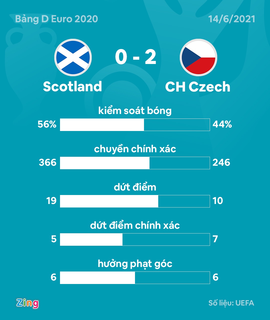 Chiến thắng trước Scotland đưa CH Czech lên vị trí dẫn đầu tại bảng D. Thầy trò HLV Jaroslav Silhavy có cùng 3 điểm với tuyển Anh, nhưng xếp trên do hơn hiệu số. Ở lượt tiếp theo, CH Czech sẽ gặp Croatia, trong khi Scotland chạm trán tuyển Anh.